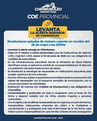 El Comité de Operaciones de Emergencia (COE) Provincial de Chimborazo convocó de manera urgente a una reunión virtual el miércoles 28 de mayo, donde se adoptaron nuevas resoluciones para enfrentar la propagación de la tosferina. Entre las decisiones destacan el levantamiento de la alerta naranja y el retorno a clases presenciales a partir del 2 de junio de 2025.