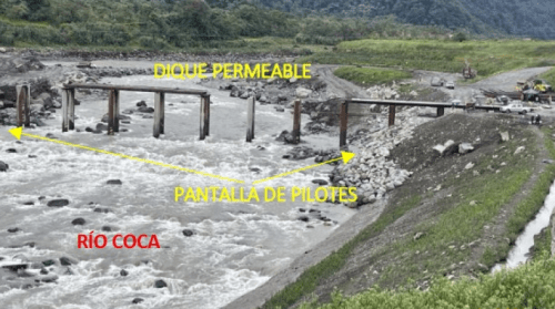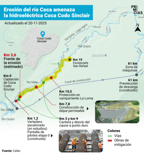 La amenaza de la erosión regresiva del río Coca, que avanza peligrosamente hacia las obras de captación de la mayor hidroeléctrica de Ecuador, Coca Codo Sinclair, ha obligado al Gobierno a intensificar las medidas de protección. La ministra de Ambiente y Energía, Inés Manzano, anunció la construcción de un segundo dique permeable, sumándose al que actualmente se encuentra en construcción para crear una barrera rígida que desacelere el fenómeno. La erosión ya se encuentra a solo 3,6 kilómetros de la infraestructura vital.