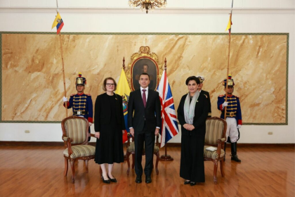 El presidente de la República, Daniel Noboa, encabezó este miércoles 8 de octubre de 2025 la ceremonia oficial para recibir las cartas credenciales de los nuevos embajadores de China, Reino Unido y Ca...