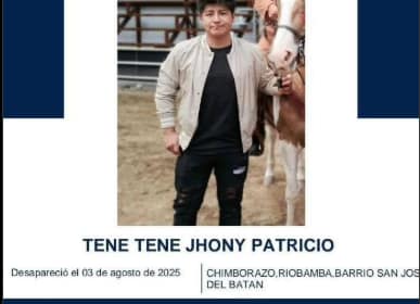 El cuerpo de Jhony Patricio Tene, reportado como desaparecido el domingo03 de agosto de 2025 en el sector de Batan, Riobamba, fue hallado sin vida este 9 de agosto de 2025 en un reservorio de invernad...